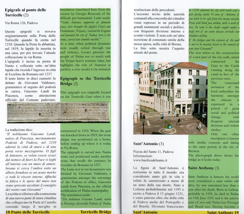 Da qualche tempo il visitatore, ma anche il pellegrino o il turista, giungendo a Padova, la città del Santo, può percorrere un itinerario di alto valore sociale ed educativo, accompagnato da una preziosa guida bilingue (italiano e inglese), curata dal MOVIMENTO INTERNAZIONALE DELLA RICONCILIAZIONE – SEDE DI PADOVA, Percorsi di pace e di nonviolenza a Padova – Luoghi, personaggi, eventi, testimonianze (II edizione, 2015).