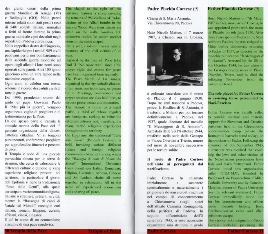 Utilissima, quindi, e molto ben strutturata questa inconsueta guida di Padova, che merita di essere conosciuta e valorizzata. In essa trovano adeguato spazio alcune figure, storie e luoghi strettamente o indirettamente connessi al nostro Servo di Dio Placido Cortese: Sant’Antonio, innanzitutto, difensore degli oppressi e testimone di pace e di riconciliazione; le sorelle Martini; Padre Mariano Girotto; Concetto Marchesi; il Tempio dell’Internato Ignoto e il Museo dell’Internamento; il Giardino dei Giusti del mondo…